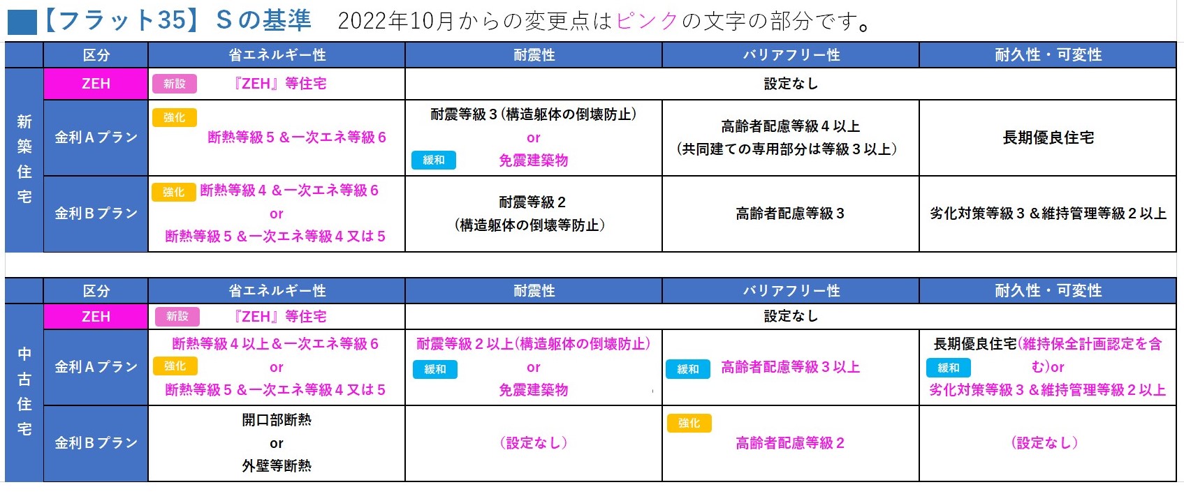 脱炭素社会の実現に向けた取組を加速させるため、2022年10月設計検査申請分から基準の見直しとなり、【フラット35】Sの省エネルギー性の基準が強化されます。また免震建築物においては、【フラット35】S(金利Bプラン)から、【フラット35】S(金利Aプラン)の対象に見直され、基準の緩和となります。