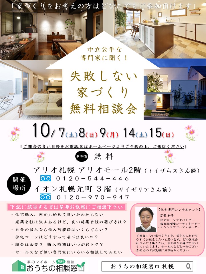 今週末と来週末は是非、おうちの相談窓口アリオ札幌店またはイオン札幌元町店にお越しください。